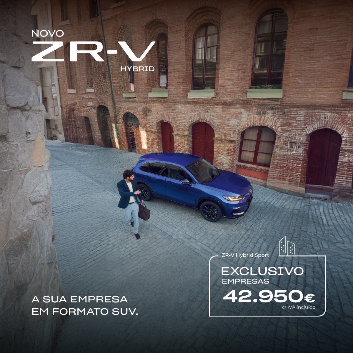 *Preço exclusivo para empresas e ENIs para modelo Honda ZR-V e:HEV Sport, incluindo despesas de legalização, transporte, pintura metalizada e ecovalor. Limitado ao stock existente nos concessionários aderentes no continente. Para as ilhas, acresce o custo de transporte marítimo. Imagem não contratual. Condições válidas para unidades em stock abrangidas pela campanha até 31 de março de 2026. As imagens e equipamentos apresentados são meramente ilustrativos e podem não corresponder às versões em campanha ou comercializadas em Portugal. Consumos em ciclo combinado (l/100 km): 5.8 L. Emissões CO2 (g/km): 131